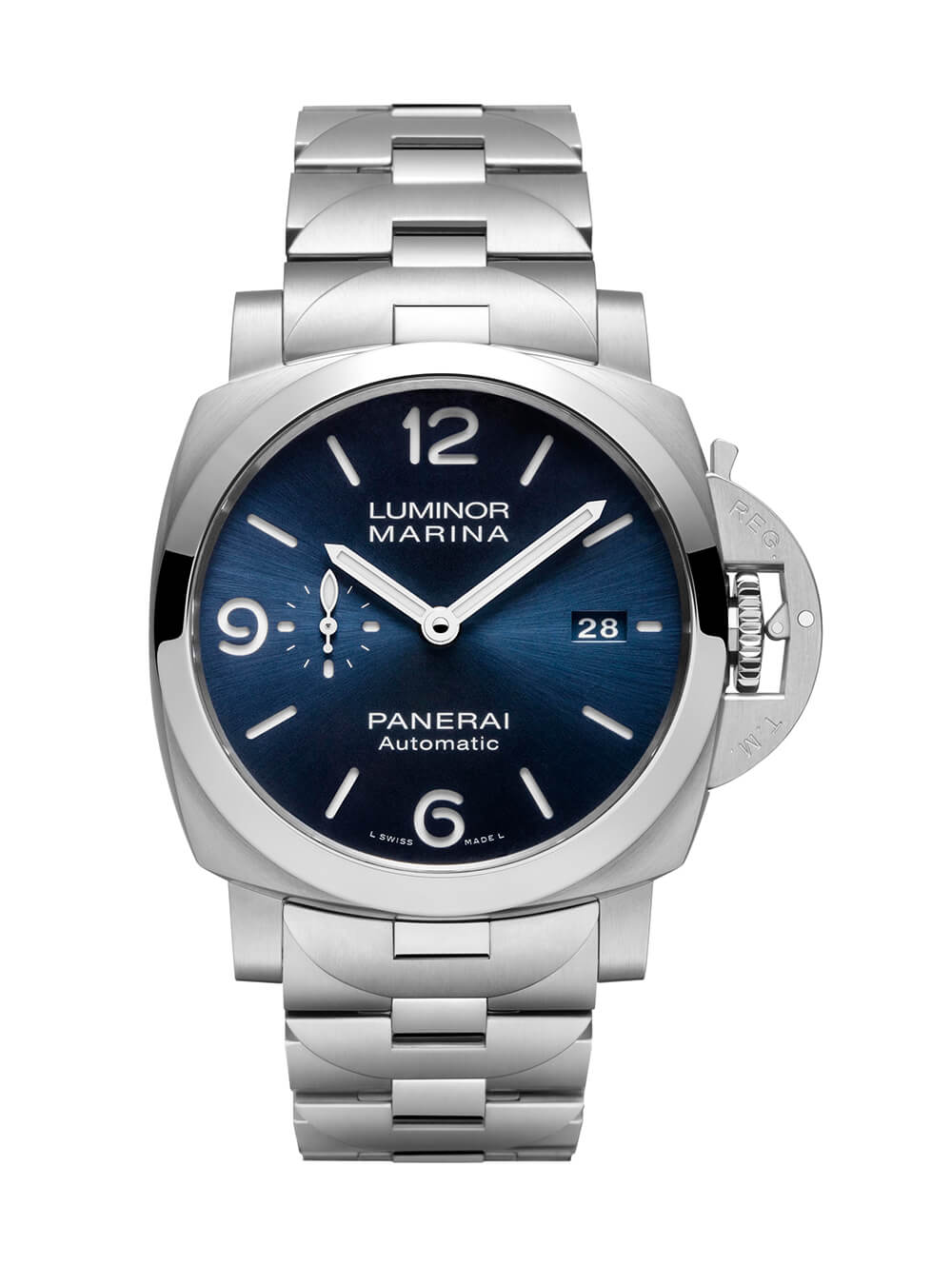 Luminor Marina Specchio Blu 采用沛納海于 2017 年推出的全新精鋼一體式表鏈,與 Luminor 標志性表冠護罩的輪廓相呼應,每個鏈節上都有凸起的半圓形部分,同時通過交替排列拋光和緞面鏈接。