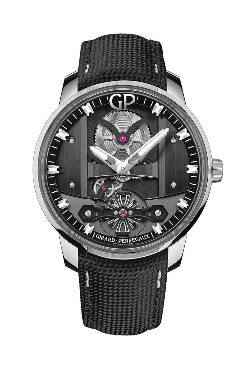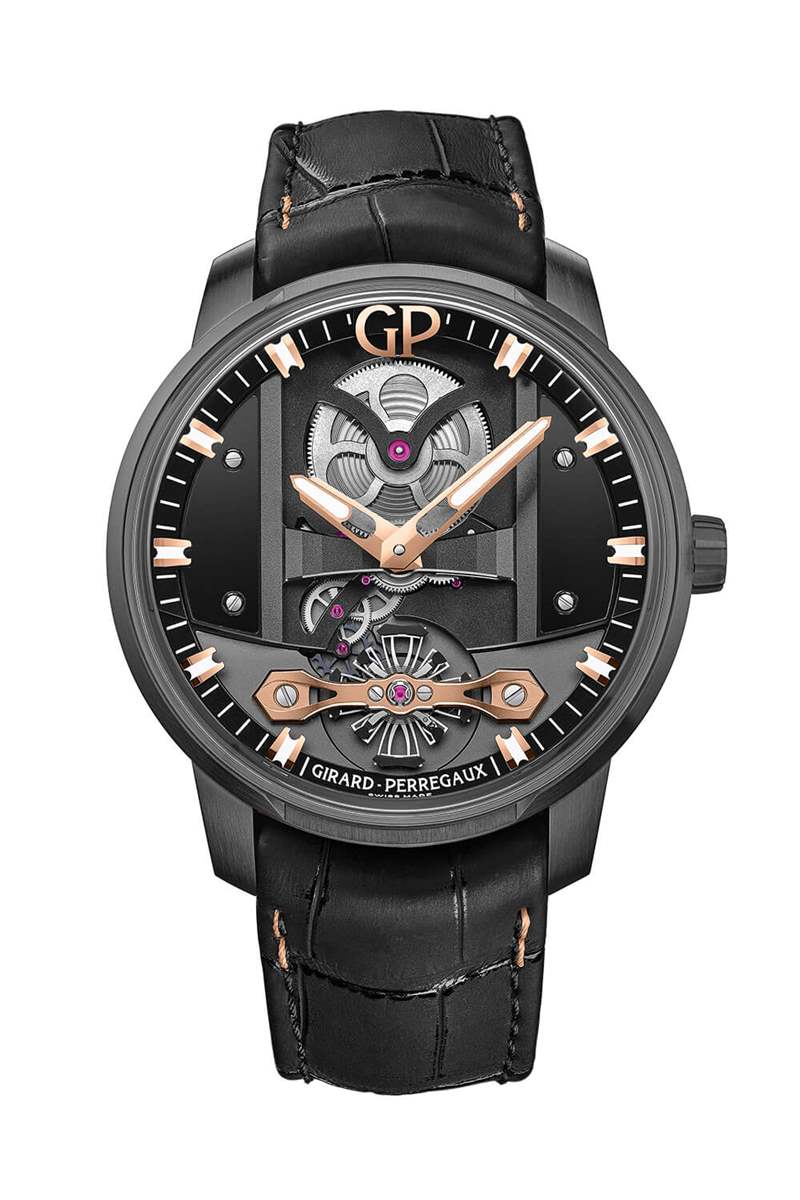 這不是經(jīng)典的三座金橋。這是對 Girard-Perregaux 以橋板為基礎(chǔ)的癡迷的鮮明現(xiàn)代重新詮釋,選擇了一個光滑的開放式表盤,兩側(cè)以啞光黑色金屬制品為主,并配有可見的螺絲。中央時針和分針(這里沒有秒針)由刻面黑色橋板支撐,可以很好地捕捉光線。
