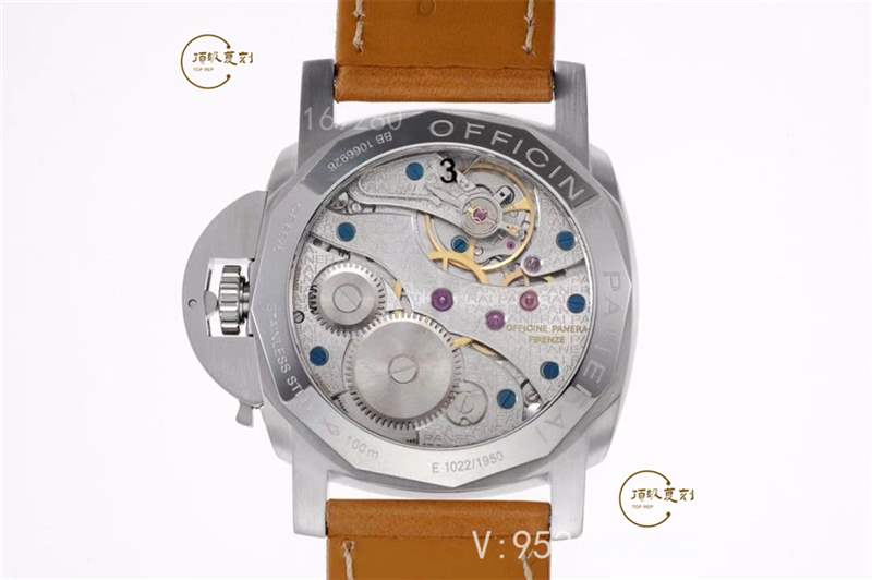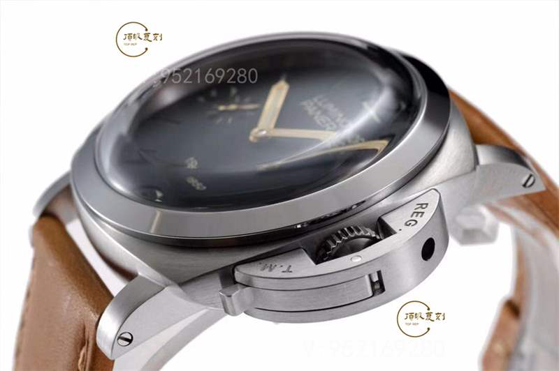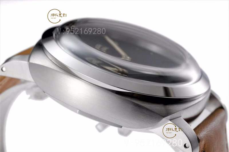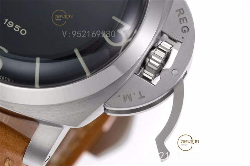 這個泡泡鏡是這個系列的特點,側面看過去有魚眼的效果,數字會有明顯的拉伸視覺感(并不是突起的鏡面就叫泡泡鏡),現在采用泡泡鏡的沛納海型號其實很少的,畢竟這么大的面積這個厚度做成這個效果成本本來就不低,哪怕正品也是要考慮成本最小化。這個設計本來是復古19世紀中葉時期碩大的亞克力鏡面的,因為藍寶石鏡面的誕生,在21世紀沛納海復刻這個系列的時候把鏡面改成了藍寶石,如果喜歡亞克力的朋友可以留意他們的372型號,不過我相信現在很少人喜歡帶一天就有劃痕的鏡面吧?但是亞克力有他們天生優勢的,比如行軍打仗就很喜歡用亞克力的表盤,沛納海372也是曾經成為軍用手表,因為鏡面耐摔。