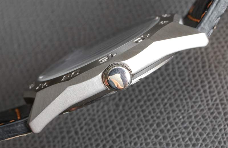 這讓我對那些和我一樣喜歡 Eco-Drive Super Titanium 的人提出了一個奇怪的建議。獲取 AW0060-03E 表盤,然后是手鐲上的其中一個型號(例如 AW0060-54A),然后將手鐲換成皮革表帶。表帶實際上很好看,但你可能知道我是手鐲的傻瓜,所以我更喜歡它。兩條皮表帶外側有鴕鳥紋,看起來還不錯,不像廉價的假鱷魚紋。在評測過的手表上,表帶是黑色的,帶有橙色縫線以匹配秒針。請注意與表殼設計主題相匹配的定制表帶扣。
