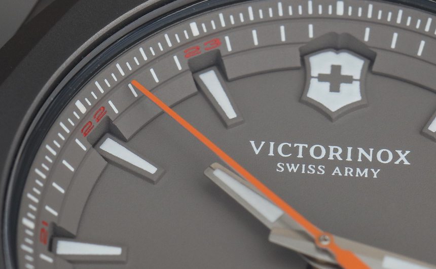 與標準 INOX 的拉絲和拋光鋼表殼不同,Victorinox Swiss Army 采用全噴砂處理鈦金屬表殼。我有一種感覺,這是 2 級和 5 級鈦金屬,這實際上很有趣,因為 INOX 式表殼的清晰角度和精確曲線做得非常好。與鋼相比,鈦的灰色外觀也在設計中得到了強調。此外,表殼的啞光處理流向表盤,為這款生活方式運動手表帶來更加清醒、工具風格的外觀。