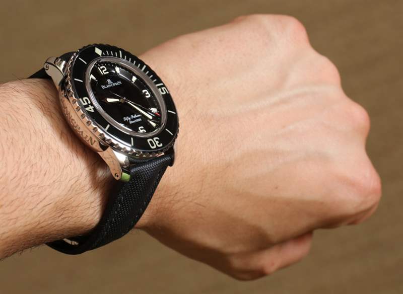 優勢:?45 毫米寬和內部機芯,寶珀五十噚 Automatique 5015(aBlogtoWatch 評論在這里)系列有一個可用的鋼模型,帶有匹配的表鏈和黑色表盤,在主題上與勞力士潛航者相同。它很昂貴,但它也制作精良且美觀。