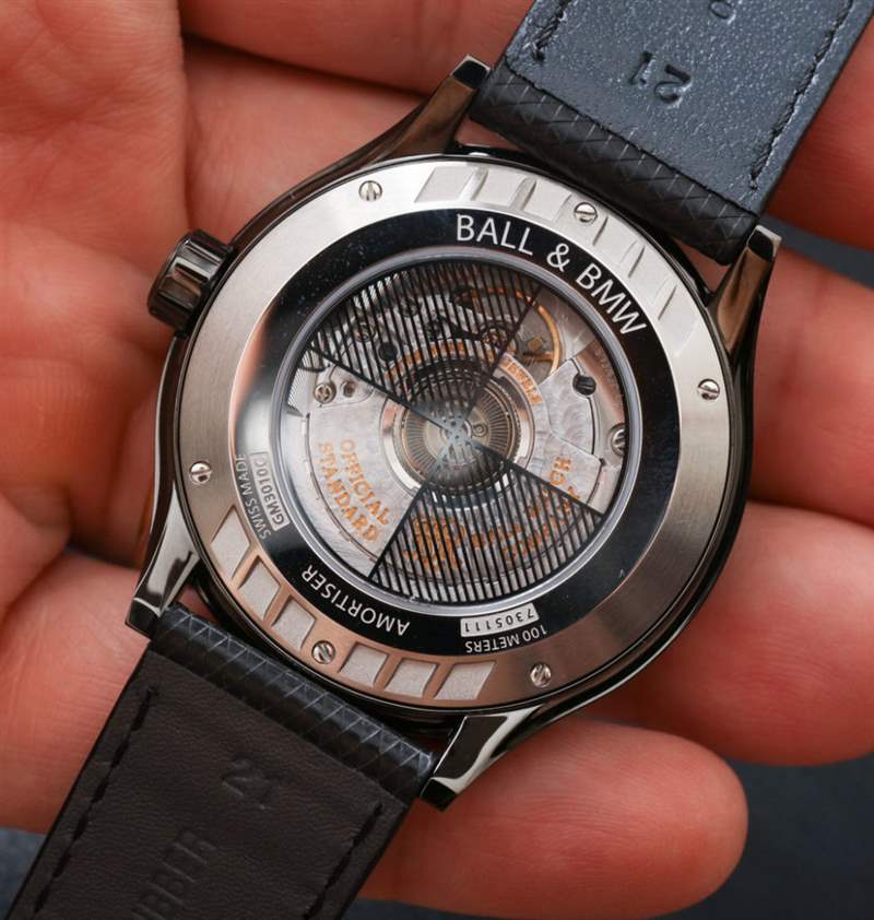 Ball For BMW GMT 手表內部是 Ball 口徑 RR1201-C 自動機芯。這是一個基本的瑞士 ETA 或 Sellita 機械機芯,由 Ball 使用定制轉子進行了輕微修改,并且每個機芯都獲得了 COSC 天文臺認證。該機芯以 4 赫茲(28,800 次/小時)運行,并具有大約兩天的動力儲存。