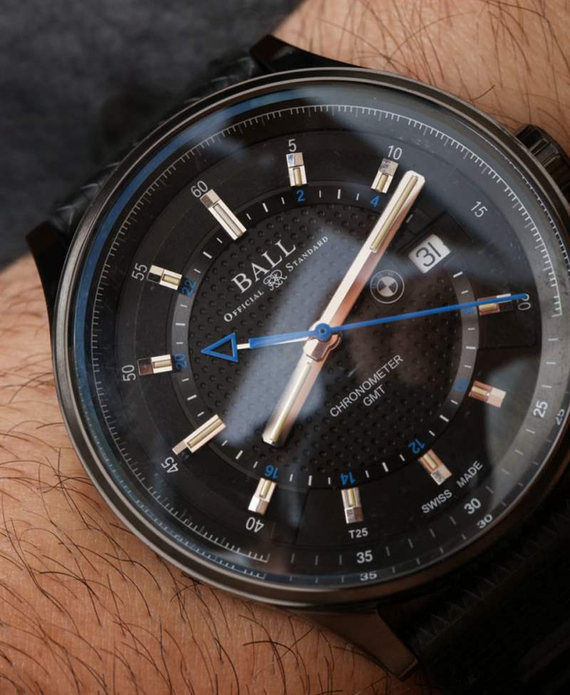 Ball For BMW GMT 寬 42 毫米,厚 12.64 毫米,是一款舒適且多功能的手腕時計。相對較薄的表圈可提供最大的表盤空間,既清晰又寬敞。Ball 設計了這款和其他帶有復雜表盤的 Ball For BMW 手表,盡管各種紋理和裝飾元素并沒有真正妨礙易讀性。這在一定程度上要歸功于寬大的指針和突出的時標。請注意,這些當然是 Ball 手表,這意味著它們在時標和指針上都使用自發(fā)光氚氣管。