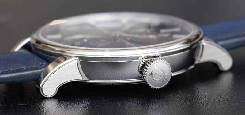 43 毫米寬(防水深度達 30 米),采用看似復雜(但精致)的精鋼表殼,亞諾表八天皇家海軍腕表的厚度也僅為 10.7 毫米,并配有寬大的藍寶石水晶底蓋窗口,展示了全新的內部機芯-制造手動上鏈機芯(稍后詳細介紹)。表盤布局是典型的“航海天文臺表”,12 點鐘下方為時間主表盤,動力儲存指示盤呈對稱布局,6 點鐘上方為小秒盤。