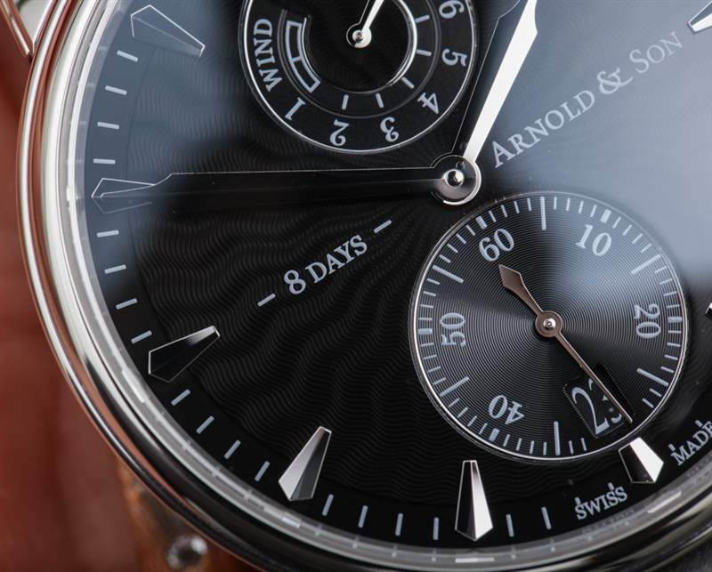 表盤上的易讀性和性感性很高,在我看來,這些表盤恰到好處地融合了優雅和精致,并且有吸引注意力的趨勢。堅固而傳統的指針增添了陽剛之氣,Arnold & Son 甚至能夠在組合中插入日期指示器窗口(在輔助秒盤中)。