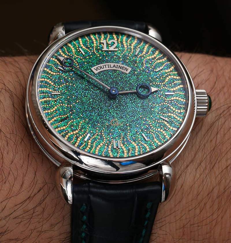 這不是Kari Voutilainen第一次與日本國寶和傳奇漆器藝術家 Kitamura Tatsuo(也稱為“Unryuan”)合作。Kitamura 的工藝品有多種不同的形式,當他與 Voutilainen 合作時,通常是精心手工組裝的馬賽克表盤,這些表盤結合了黃金和軟體動物貝殼等一系列自然元素和材料。這款手表叫做 Voutilainen 28 Hisui,在日語中是玉的意思,看看 Voutilainen 28 Hisui 的表盤顏色,就很容易看出原因了。