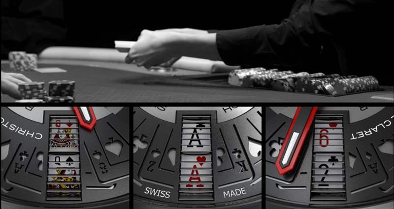 雖然 Blackjack 21 手表在表盤(pán)下方使用一系列圓盤(pán)來(lái)顯示所有紙牌組合,但考慮到顯示所需的組合和紙牌數(shù)量增加,Poker 可能需要稍微復(fù)雜一些的系統(tǒng)。預(yù)覽圖像不僅暗示了我們?cè)谟螒蚴直硐盗兄幸呀?jīng)習(xí)以為常的相似美學(xué)風(fēng)格(包括我喜歡的那些鑲有紅寶石的指針),而且看起來(lái)像旋轉(zhuǎn)百葉窗式顯示器,每個(gè)顯示器可以顯示三個(gè)圖像控制板。