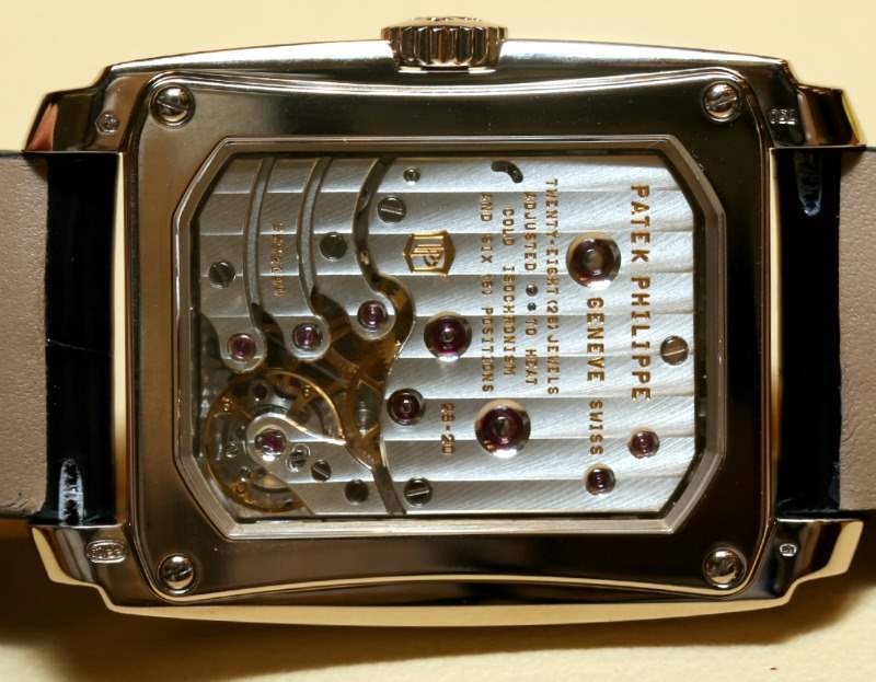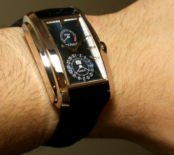 很難抗拒“啞光藍(lán)色旭日形”表盤(如百達(dá)翡麗的稱呼)的魅力,但加上拋光的太妃糖指針,在光線下的易讀性并不理想。盡管如此,盡管矩形表盤的比例令人尷尬,但就可讀性而言,百達(dá)翡麗在指針和應(yīng)用時(shí)標(biāo)方面做得很好?!般y白色蛋白石”表盤非常棒。非常輕,它與那些啞光黑色混合得非常好。百達(dá)翡麗是目前生產(chǎn)這些深黑色但細(xì)節(jié)豐富的黑色指針和時(shí)標(biāo)的王者。