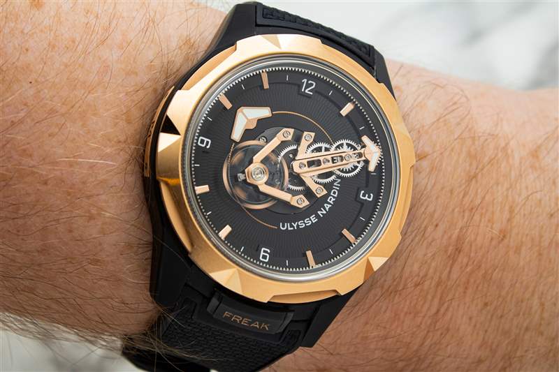與表殼一樣,雅典表 Freak ONE 的鏤空表盤(pán)以之前的 Freak 型號(hào)為基礎(chǔ),但以更簡(jiǎn)潔、更精致的方式呈現(xiàn)了這些概念。嚴(yán)格來(lái)說(shuō),只有帶有淺色印刷阿拉伯?dāng)?shù)字和鑲貼金質(zhì)時(shí)標(biāo)的狹窄外圈是真正的表盤(pán)表面,藍(lán)寶石水晶下方的所有其他部件都是機(jī)芯部件。大部分空間被一個(gè)寬大的啞光黑色圓盤(pán)占據(jù),圓盤(pán)上有精致的脊?fàn)罴y理,并印有雅典表的文字標(biāo)志。由于此處采用寬大且?guī)в写罅恳构獾慕鹕切涡螤睿撔D(zhuǎn)圓盤(pán)可用作時(shí)針。然而,真正搶盡風(fēng)頭的是分針。這是 Freak 系列的標(biāo)志性碟形盤(pán),這是一個(gè)旋轉(zhuǎn)齒輪系組件,每小時(shí)在表盤(pán)上繞一圈,本質(zhì)上允許機(jī)芯,圍繞自身旋轉(zhuǎn)。與之前的 Freak 迭代相比,該組件在視覺(jué)上顯著簡(jiǎn)化,但 Ulysse Nardin 在形式上添加了對(duì)其自身傳統(tǒng)的厚顏無(wú)恥的認(rèn)可。包含齒輪系組件和分鐘標(biāo)記的主橋結(jié)構(gòu)也形成了該品牌的標(biāo)志性錨徽。錨標(biāo)志出現(xiàn)的唯一其他地方是表帶襯里,這使得這是一個(gè)令人印象深刻的克制品牌活動(dòng)。飛行擺輪橋作為分針的配重,與鏤空表盤(pán)表面上方的齒輪系一起旋轉(zhuǎn),成為動(dòng)態(tài)的視覺(jué)亮點(diǎn)。此外,由于擒縱機(jī)構(gòu)安裝在旋轉(zhuǎn)組件上,F(xiàn)reak ONE 在技術(shù)上還具備 60 分鐘陀飛輪復(fù)雜功能。這是最頑固的運(yùn)動(dòng)書(shū)呆子們的話題,