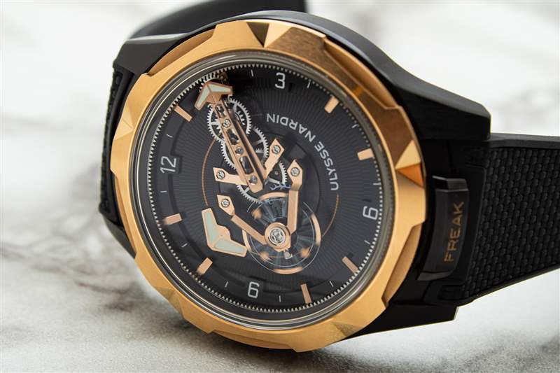 當(dāng)然,實(shí)際上 Freak ONE 并沒(méi)有什么平庸之處,仔細(xì)觀察紅金表圈就可以立即看出這一點(diǎn)。基于這種拉絲和拋光元件中尖銳的刻面圖案,這個(gè)表圈可能看起來(lái)不對(duì)齊,但這是 Freak ONE 獨(dú)特的上鏈和時(shí)間設(shè)置系統(tǒng)的唯一真正的視覺(jué)線索。翻轉(zhuǎn) 6 點(diǎn)鐘位置的“Freak”牌,旋轉(zhuǎn)表圈就會(huì)解鎖,但旋轉(zhuǎn)的不僅僅是表圈本身。扭轉(zhuǎn)這個(gè)雙向表圈還可以向前和向后調(diào)整時(shí)間設(shè)置,為佩戴者提供與 Freak ONE 啟動(dòng)對(duì)話的齒輪系的大規(guī)模觸覺(jué)連接。在背面,藍(lán)寶石顯示屏底蓋同樣非正統(tǒng)。通過(guò)逆時(shí)針旋轉(zhuǎn)底蓋外環(huán),佩戴者可以手動(dòng)為機(jī)芯上弦,盡管 Freak ONE 的創(chuàng)新上鏈系統(tǒng)使得這一點(diǎn)基本上沒(méi)有必要(稍后會(huì)詳細(xì)介紹)。雖然 Freak ONE 的外殼非常耐磨,而且充滿(mǎn)了有趣的花招,但它的致命弱點(diǎn)就是防水。這是該手表日常佩戴理念面臨的最大障礙,因?yàn)?30 米的深度等級(jí)讓 Freak ONE 根本無(wú)法勝任許多運(yùn)動(dòng)場(chǎng)合的任務(wù)。