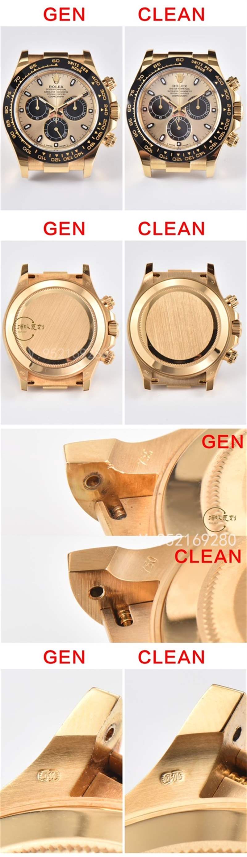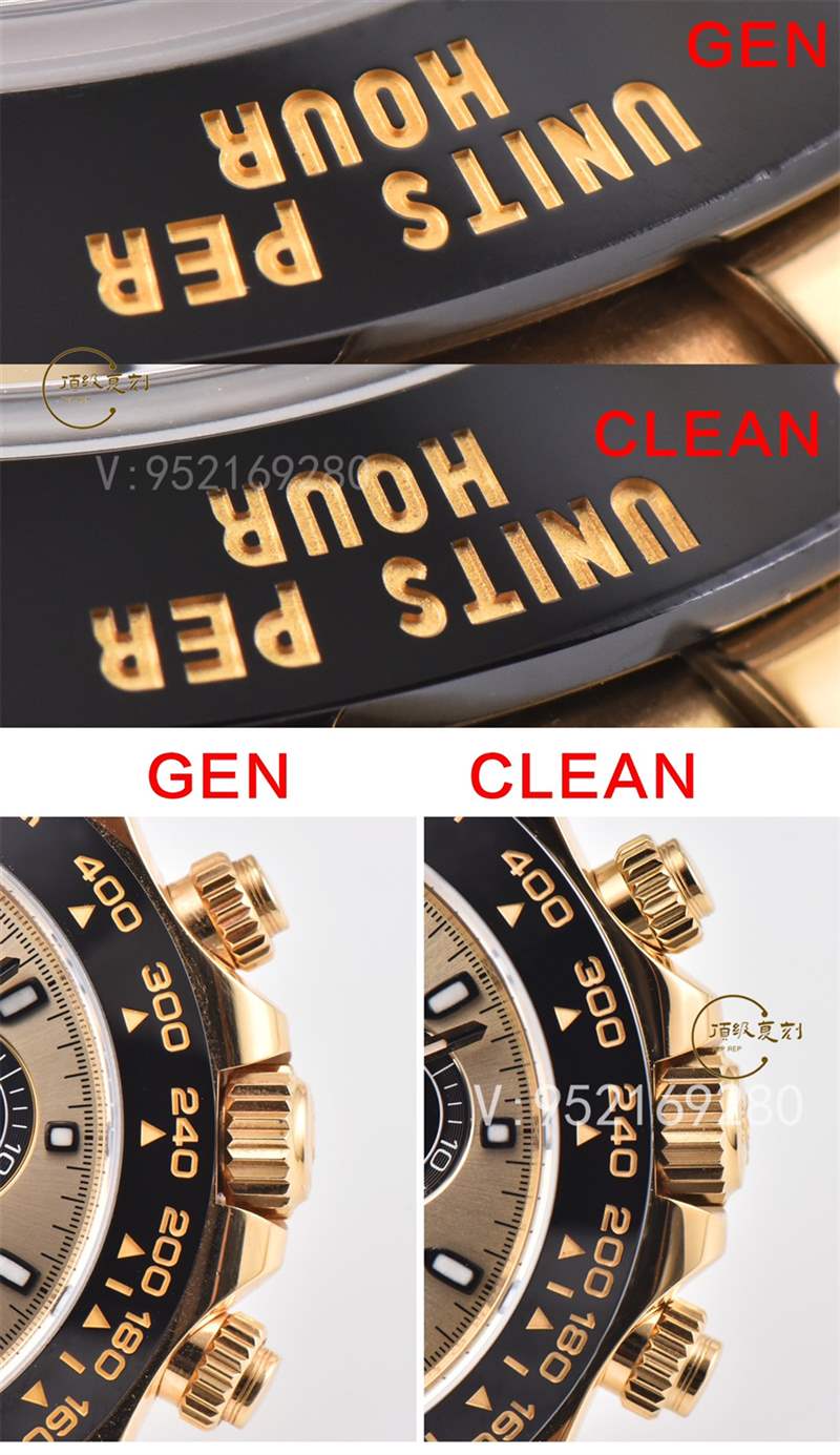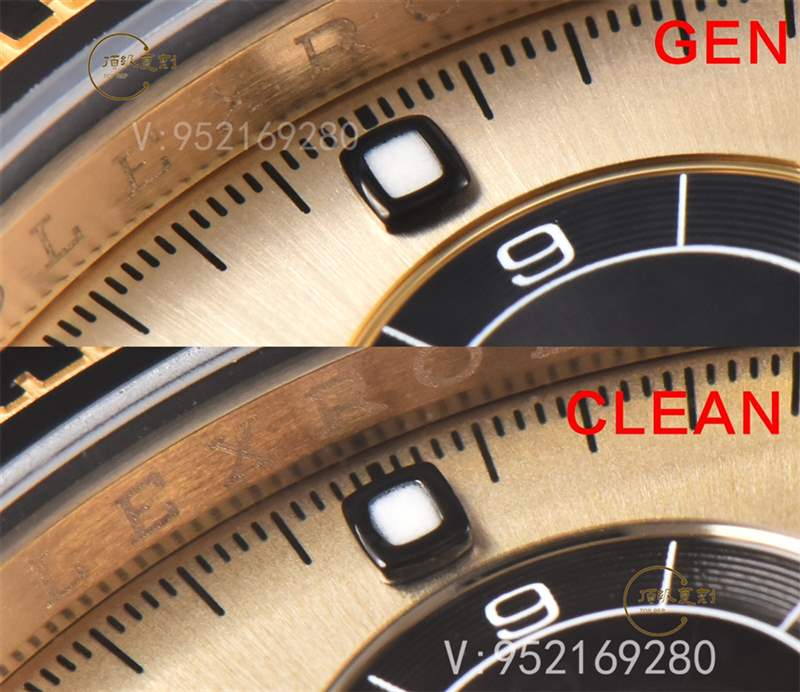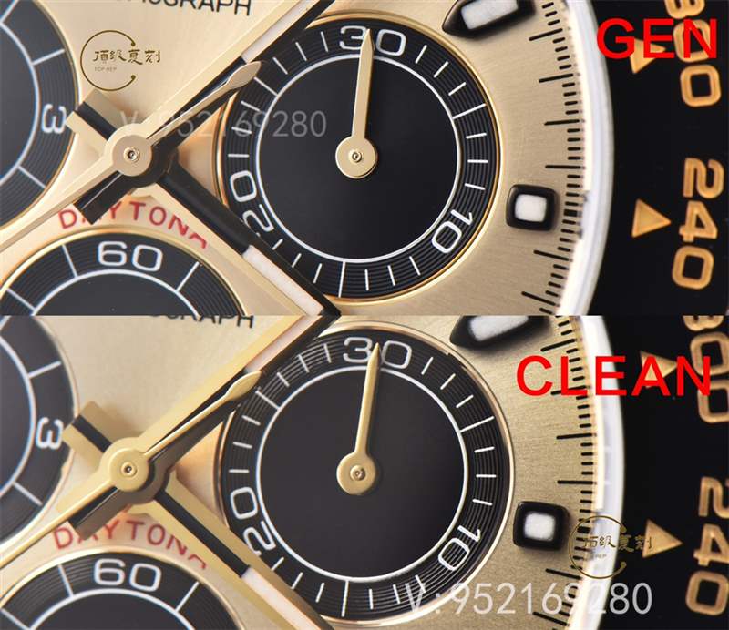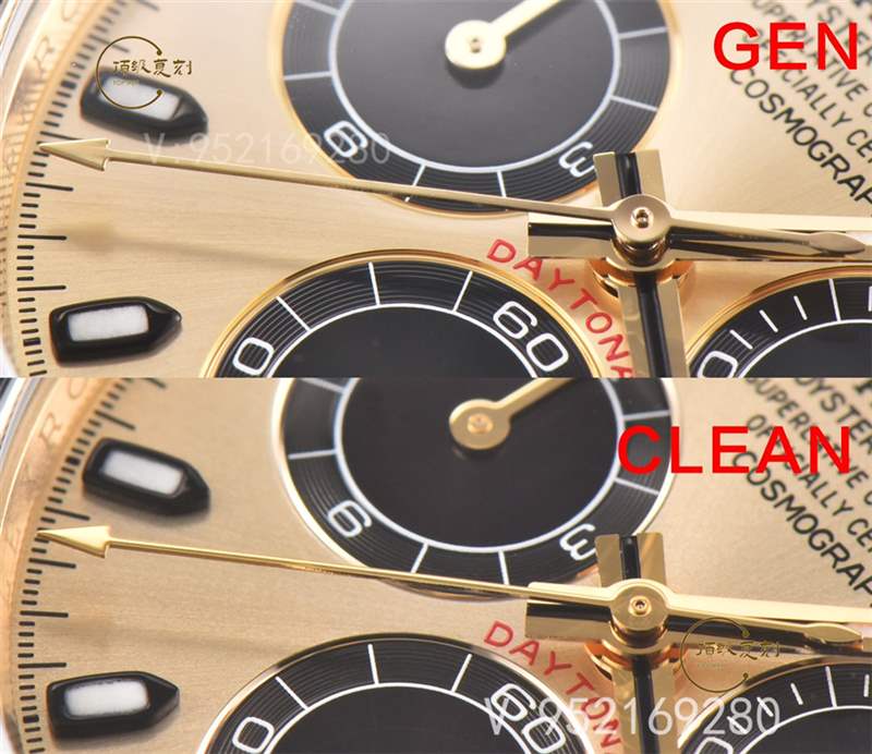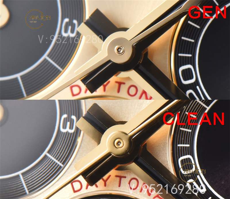 在字面方面來說,此次CLEAN廠進行了重新定義,顏色方面也是極致的達到金色為主,同時對于顏色方面也是進行了真空pvd電鍍,并非普通的噴油調(diào)色,pvd好處在于電鍍層可以控制在2-4um微米。不以及計時小眼圈的中間黑色大陽紋以及邊緣d紋完全按照真品一比一開模,對于整體細節(jié)方面也是做的很靠譜!手表的表面顏色非常接近于原來的細節(jié)!